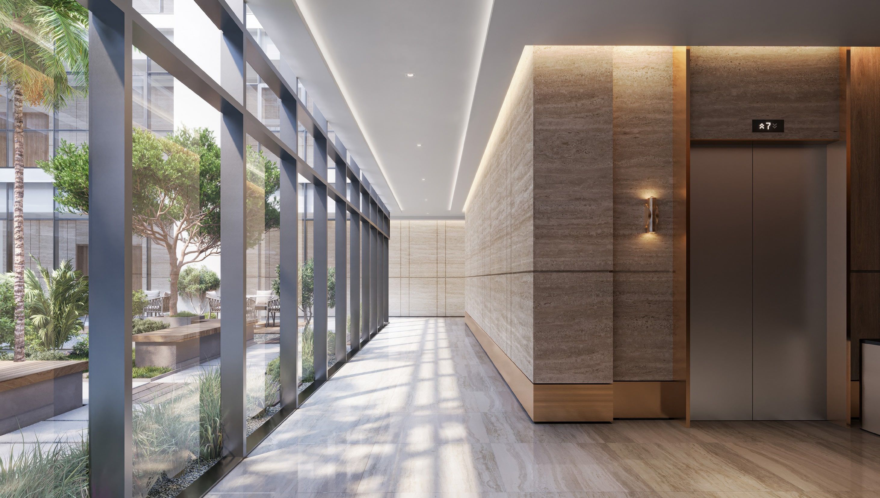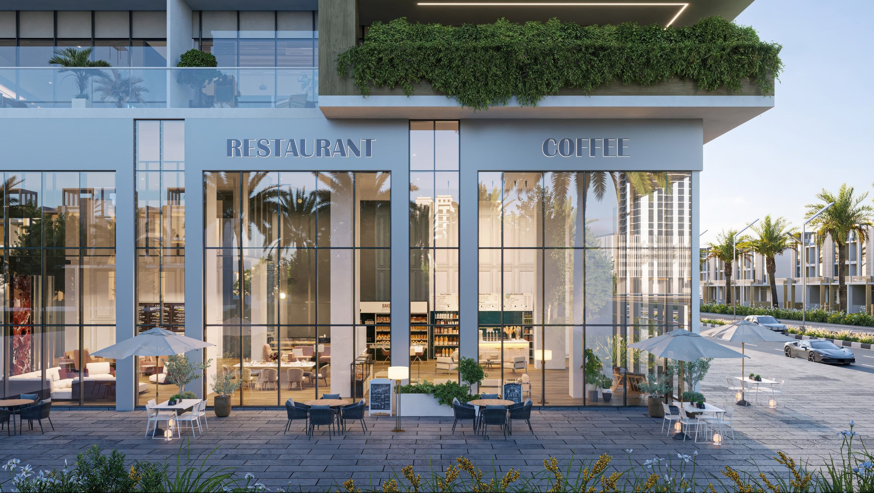 * Sleek architecture with floor-to-ceiling windows.